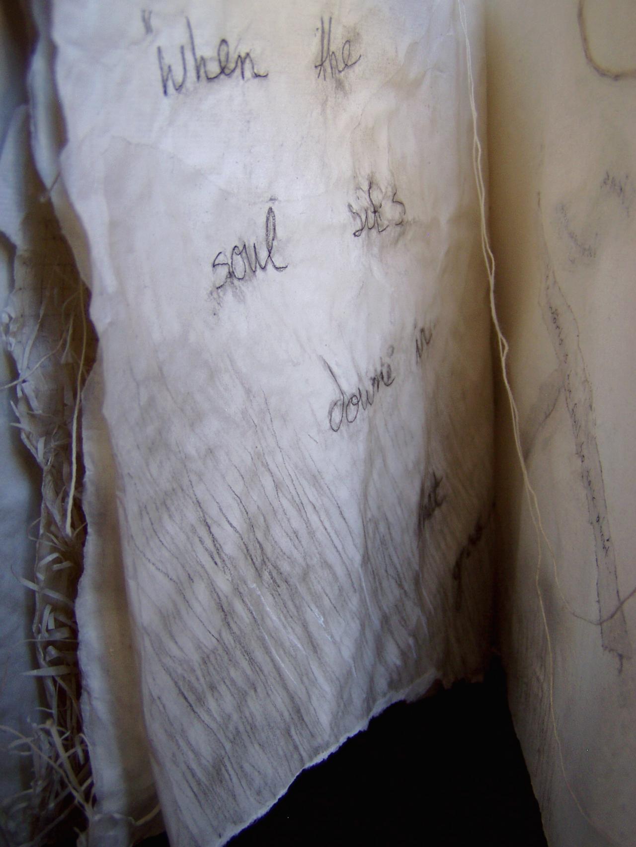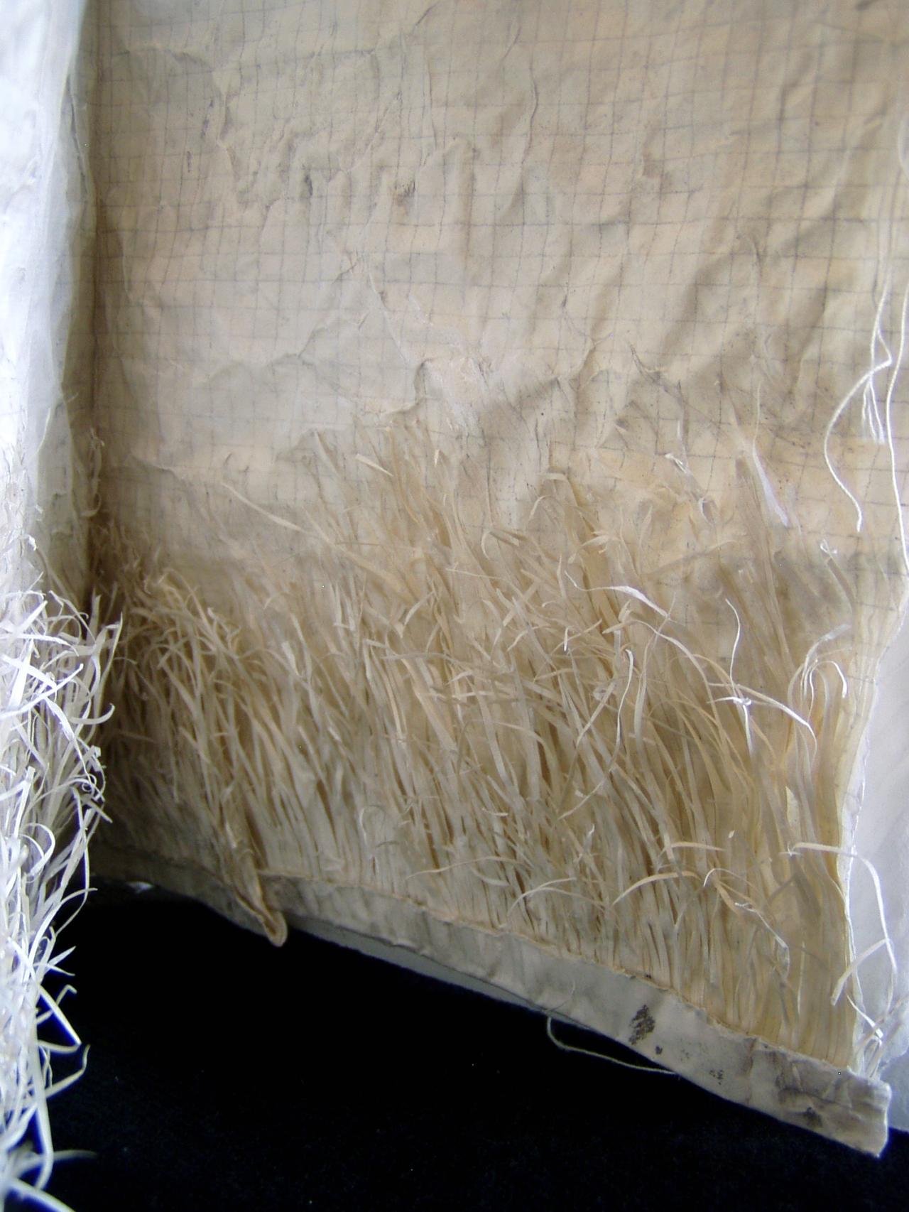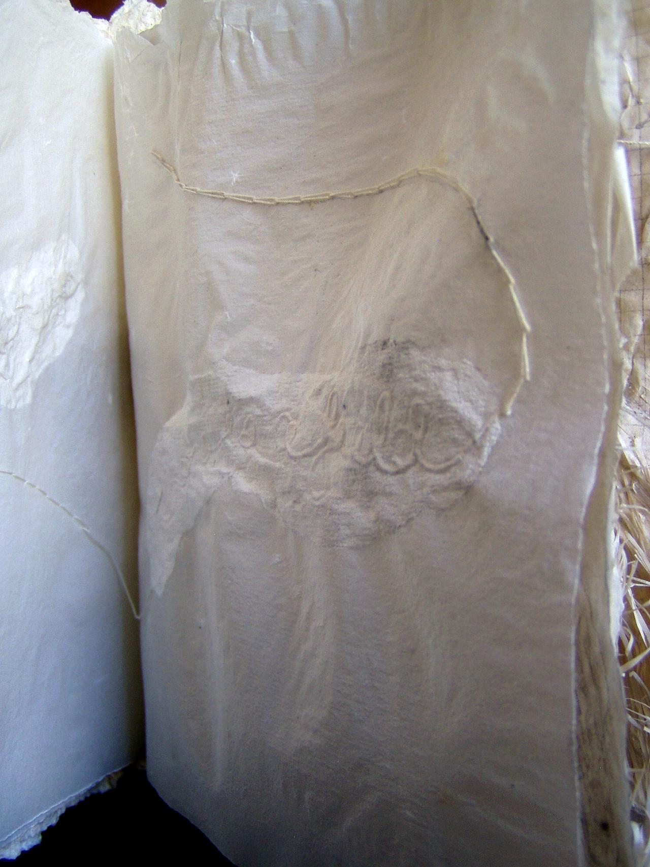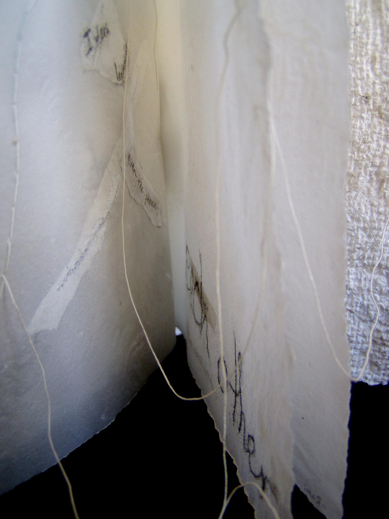Charcoal, ink, thread and collage on handmade abaca, linen and cotton paper