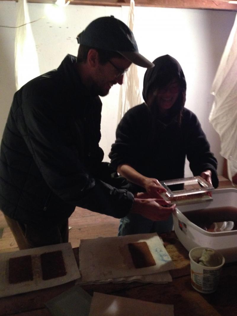 Visitor making cornhusk paper during Art Harvest Late night papermaking with Rob and Caitlyn