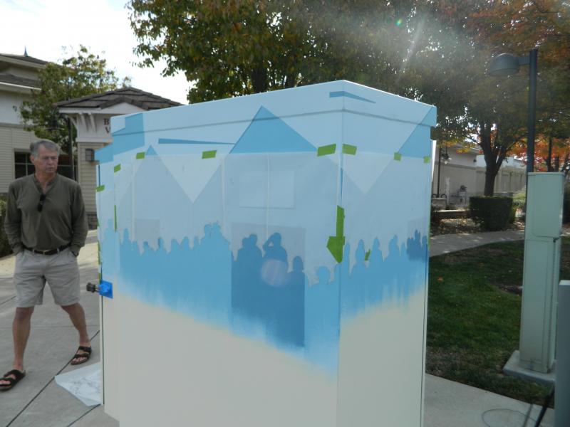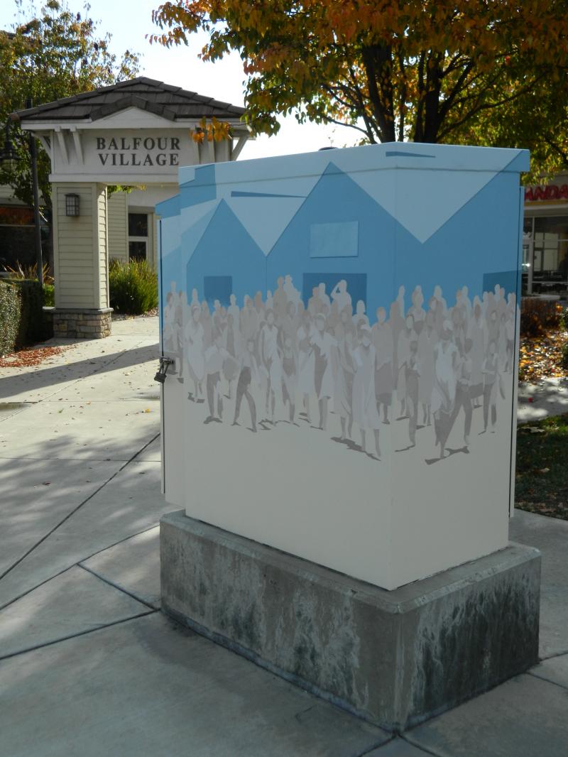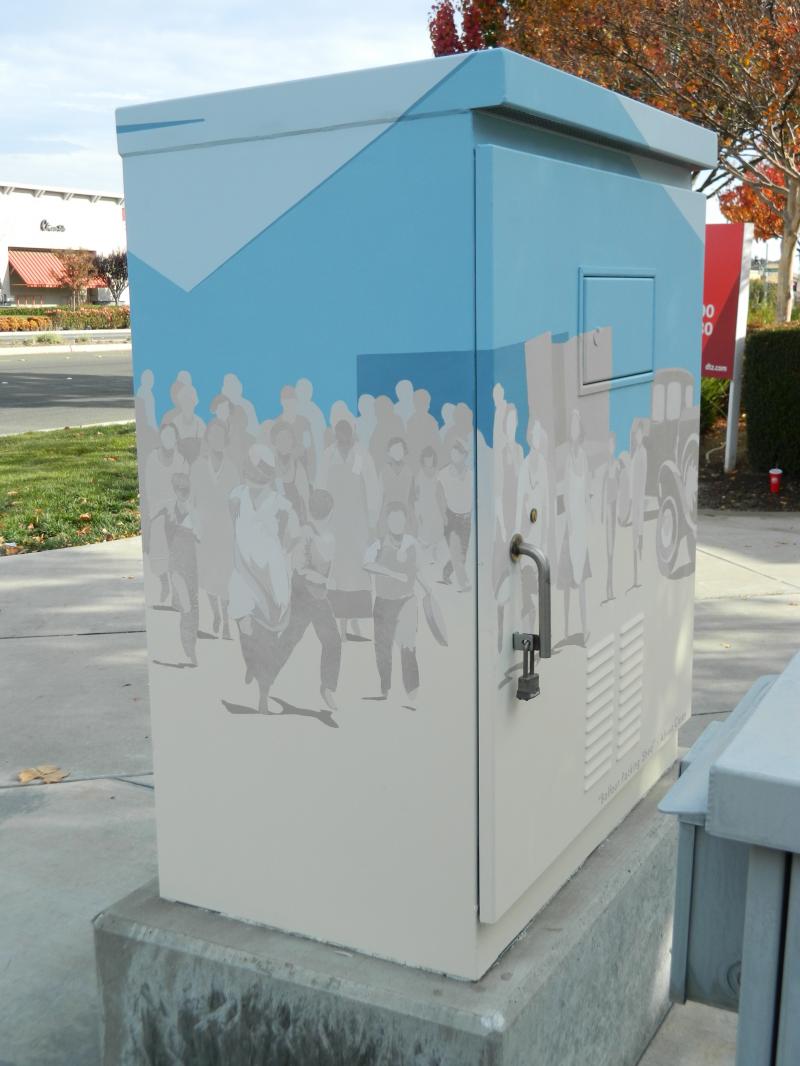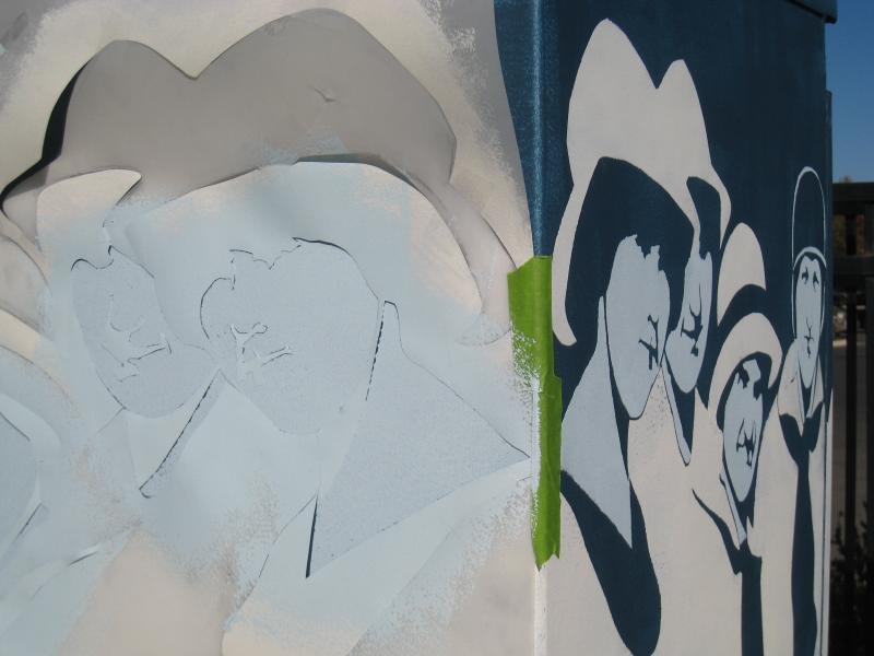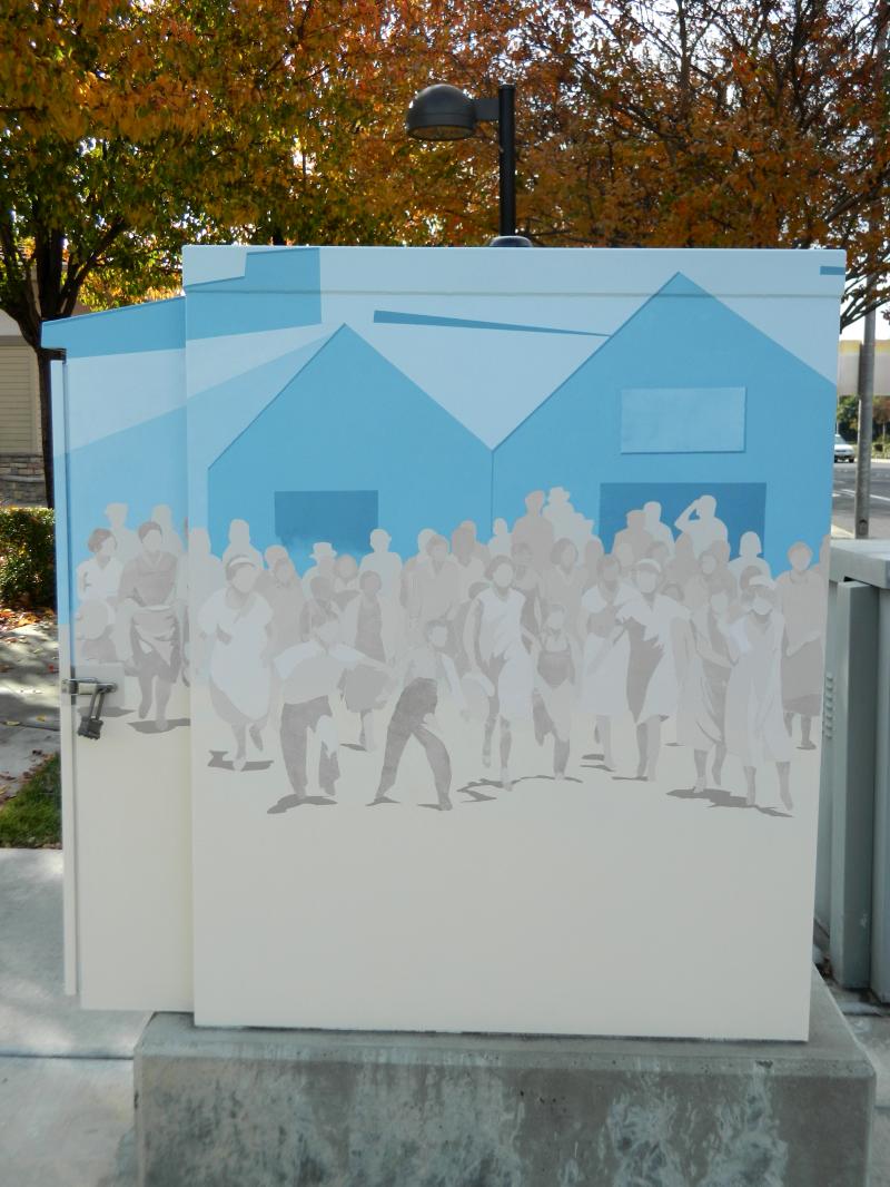 This work was a very special opportunity as my parents, John and Jody Casey, grandparents, Billie and Bearl Casey and Rita Dell’Immagine, and aunt and uncle, Mary and Jerry Black, all live in Brentwood; my parents graduated from Liberty High school and my grandmother, Billie, worked in agriculture. I'd like to thank my dad for helping me prime and hang the stencils, both of my parents for checking on me and bringing me tea and lunches, and my grandmother, Billie, for helping me put up the tedious stencil, piece by piece, of Balfour Packing Shed. I couldn't have done this without all of you!