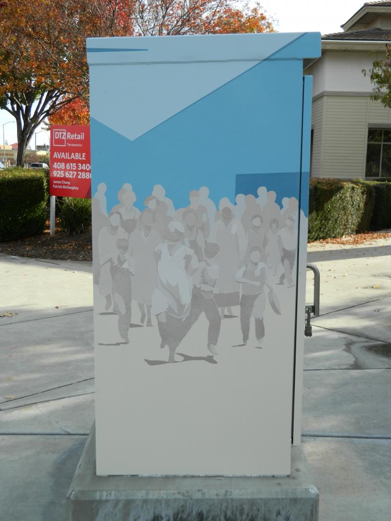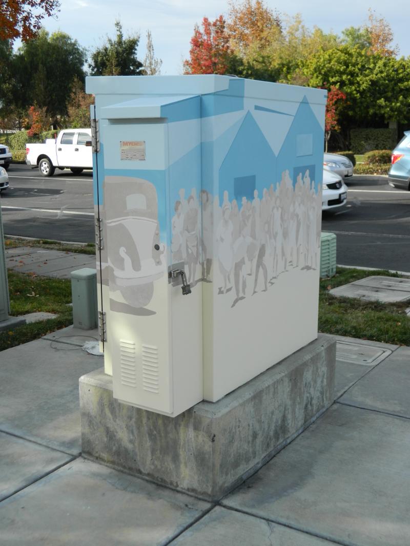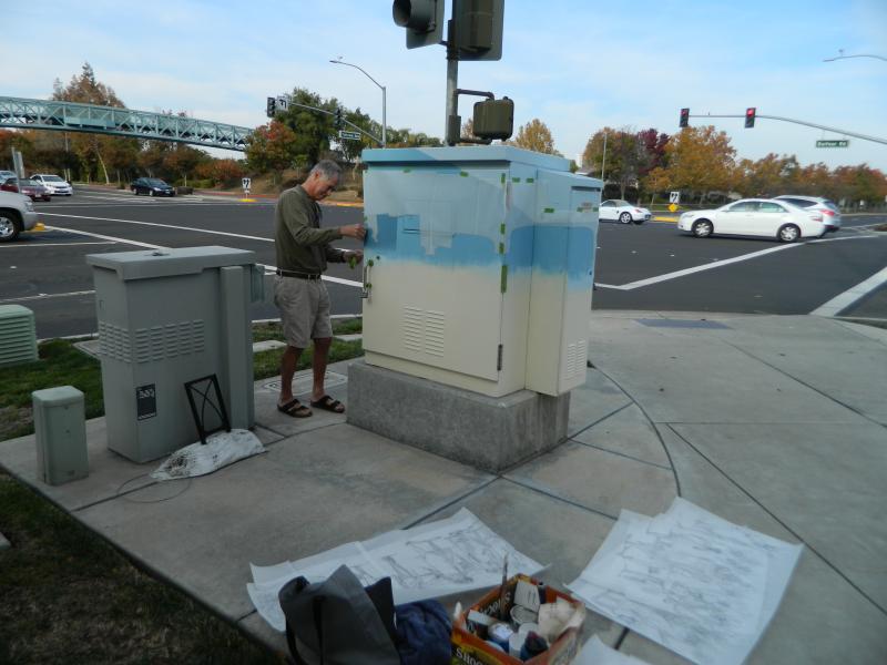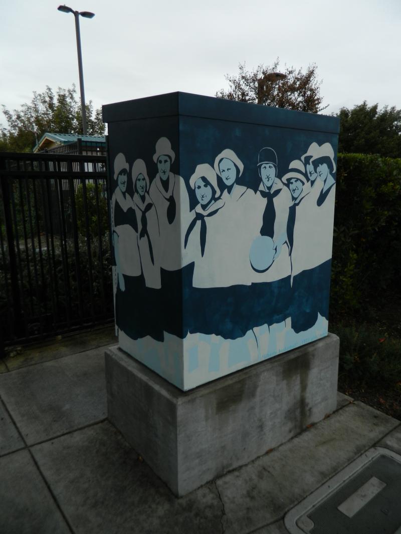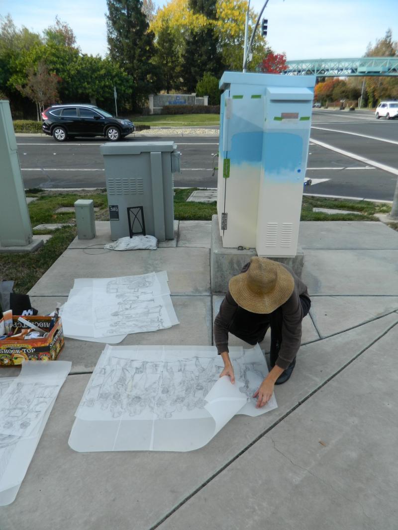 This work was a very special opportunity as my parents, John and Jody Casey, grandparents, Billie and Bearl Casey and Rita Dell’Immagine, and aunt and uncle, Mary and Jerry Black, all live in Brentwood; my parents graduated from Liberty High school and my grandmother, Billie, worked in agriculture. I'd like to thank my dad for helping me prime and hang the stencils, both of my parents for checking on me and bringing me tea and lunches, and my grandmother, Billie, for helping me put up the tedious stencil, piece by piece, of Balfour Packing Shed. I couldn't have done this without all of you!