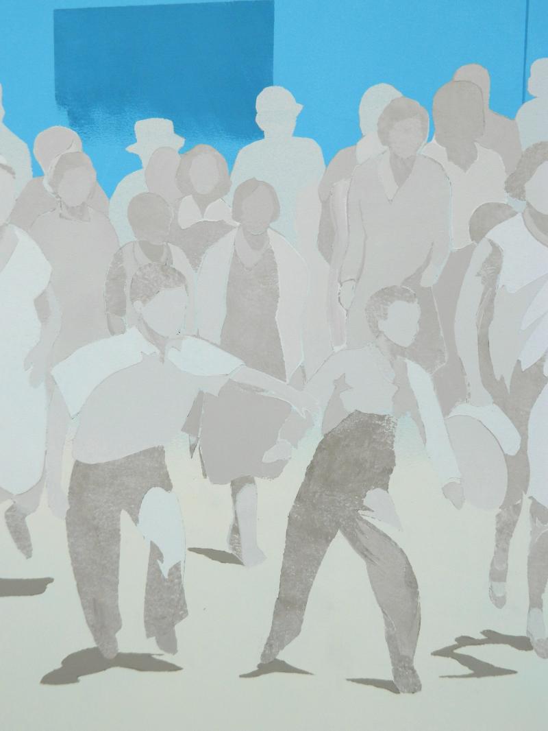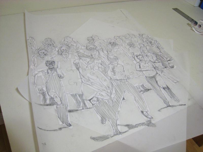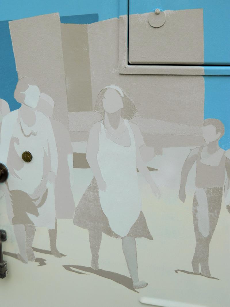 I've already painted the ground and sheds, first stencil for the figures is set.