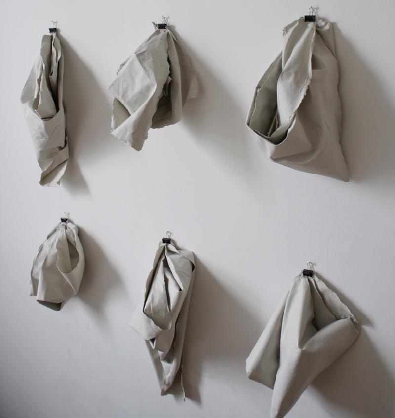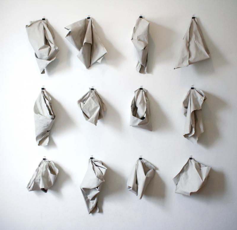 To create Drawing Specimens, I first clip a fresh, damp, handmade sheet of paper to the wall. Then, using a bodily gesture that allows for the natural curve or fold of the paper, I push and play with the sheet, gradually clipping the other three corners together with the first. I continue this process until the lines and shadows in the paper provide an engaging composition. I then let the sheet dry in the position into which my caresses and tugs have forced the sheet.