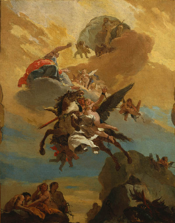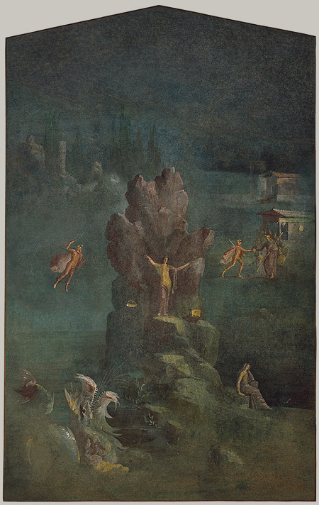 Wearing her jewels, Andromeda is chained to a sea cliff by her father. She must remain there until she is found and married. Discovered and saved by Perseus as he flies overhead, she is freed. Upon her death, Andromeda is rewarded for her hardship: Athena creates her image in the northern hemisphere of the night sky near Perseus, her husband, and Cassiopeia, her mother.