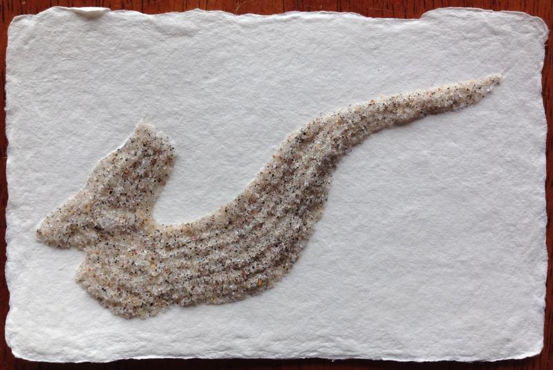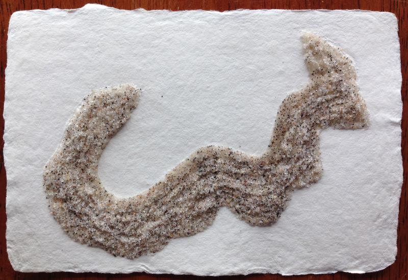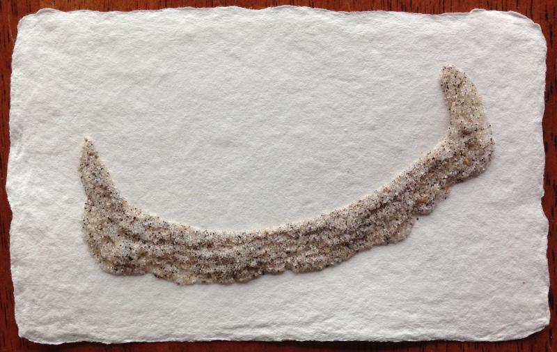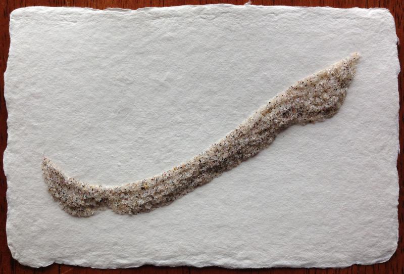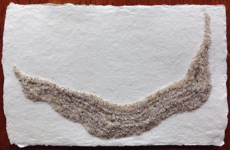 On one such walk, I came to the Fire Island breach, a break in the sand barrier caused by super storm Sandy. Contemplating the increase in the number and severity of super storms and hurricanes brought on by climate change, and the Othering implicit therein as put forth by Naomi Klein and brought to my attention by Anna Lise Jensen, I began to think about colonialism, trade, the sea, sand, protection, and lace. I remembered the disturbing painting of George Clive - cousin to the founder of British India - and his family with an Indian Maid, by Sir Joshua Reynolds, which I had seen in the Staatliche Museen, Berlin two years prior. The lower position, down cast gaze, and truncation of the "Indian Maid" makes her subordination palpable. I observed the painting closer and noticed the fine, abundant lace around the wrist and necklines of Clive, his wife, and daughter, and the more modest lace around the arm of the maid. I decided to translate the painted shape of each passage of lace into a fragile barrier island of sorts, scratching into the paper surface and applying fine rows of sand, slowly laying down each row one after the other, building grain upon grain, until the shape matched that of the exposed lace in the painting: a mock up of a "little battlement" between... what? The violence of our colonial past and the sanitary denial some inheritors of the colonizer's legacy choose to believe? The desperation of an uncertain climatic future and the comfortable historical promise of a fantasized progress? The viewer can decide.