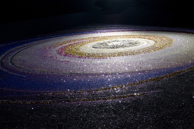 312 x 195 in. Colored beads, fake pearls, and sequins on floor
